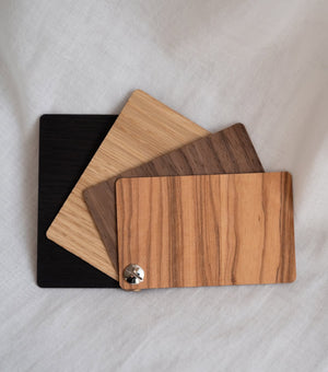 Prøvene er tynne, behandlet med samme naturlige olje som vi bruker i våre ferdige produkter og satt sammen med en praktisk metallskrue.