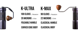 - Finjusteringsmekanisme: K-Ultra tilbyr et mer presist justeringssystem enn K-seriens Møller, med 10 tall og 100 klikk per runde. Hvert klikk flytter burringene med 20 mikron, noe som gir deg detaljert kontroll over malingsgraden.