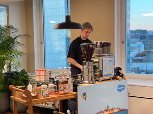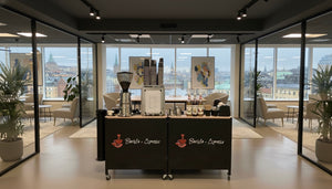 En profesjonell barista, vår egen spesialkaffe, komplett espressoutstyr og kvern, transport og oppsett, krus, sukker, smakstilsetninger, melk og mye mer! Ingen problemer – vi håndterer alt.