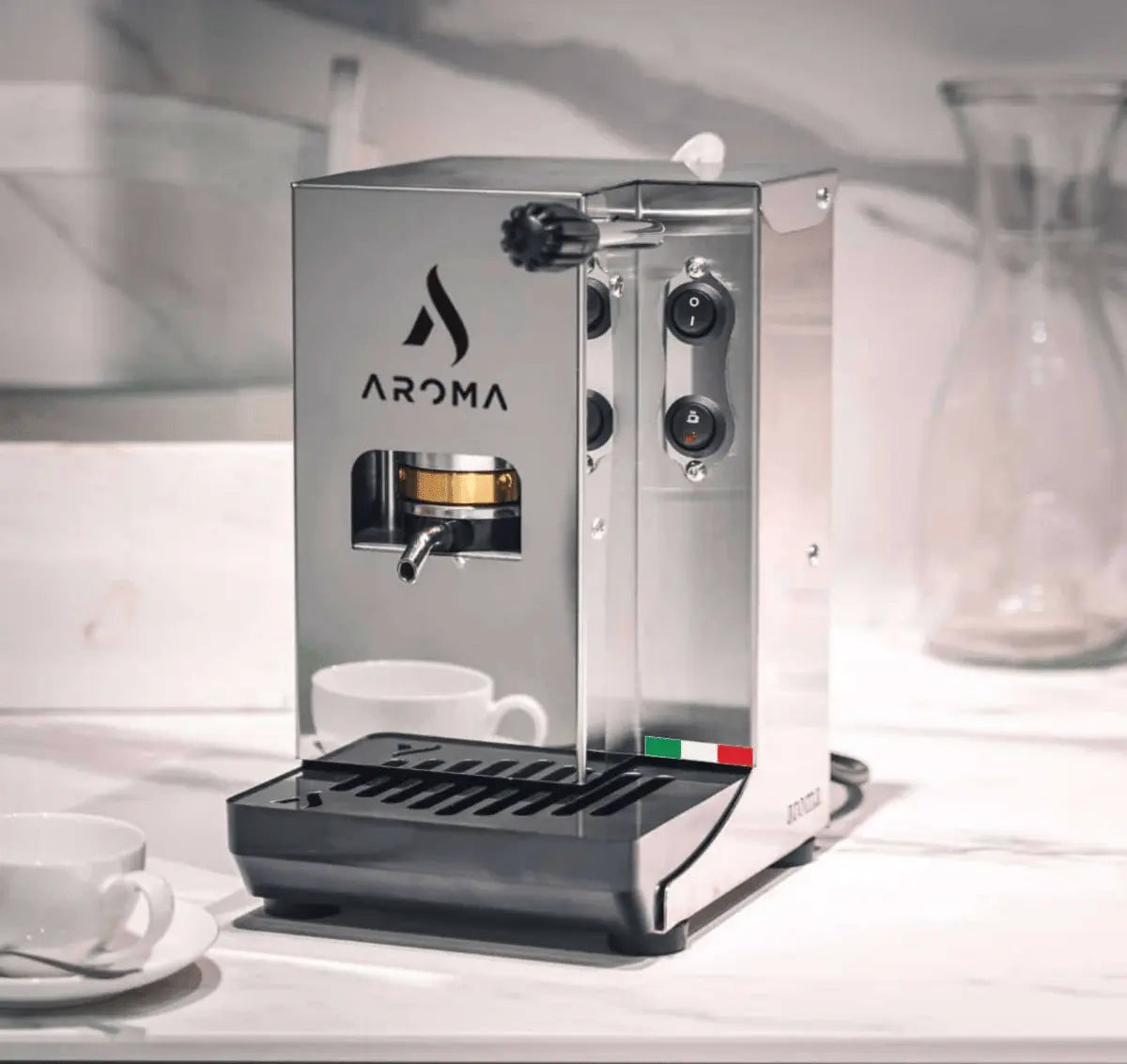Aroma er en italiensk produsent med fokus på premiumsegmentet for podbasert espresso. Merket jobber med design, patentert bryggeteknikk og slitesterk konstruksjon for å gi en autentisk espresso hjemme uten at maskinen tar over kjøkkenplassen. Dette er ikke en klassisk profesjonell espressomaskin for kafé, men den gir en uvanlig gjennomarbeidet følelse for hjemmebruk og passer for deg som vil kjøpe espressomaskin med tydelig italiensk preg. Ut fra bildet ser vi en rett, industrielt inspirert front i sølv, svart dryppbrett og synlige kontroller som forsterker det rene, funksjonelle uttrykket. Vårt ærlige råd: denne modellen passer best for deg som prioriterer E.S.E-pods og enkelhet, ikke for deg som vil jobbe med ferskmalte kaffebønner og melkeskumming.