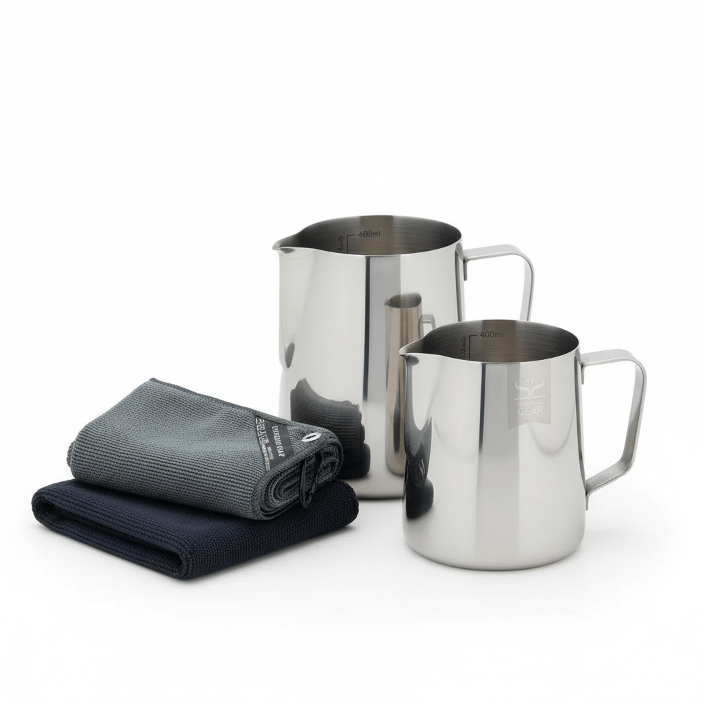 Har du nettopp kjøpt en espressomaskin eller vurderer å investere i en? Dette komplette startsettet gir deg alt du trenger for å begynne å lage profesjonelle kaffedrikker hjemme fra dag én. Med to melkekanner i forskjellige størrelser og tre høykvalitets Barista-kluter får du verktøyene som enhver barista trenger.